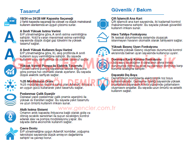 - 18/24 kw : 18kw ısıtma kapasitesi 6metre petek (120metrekare), 24kw sıcak su ısıtma kapasitesi (2farklı yerde sıcak su kullanımı)